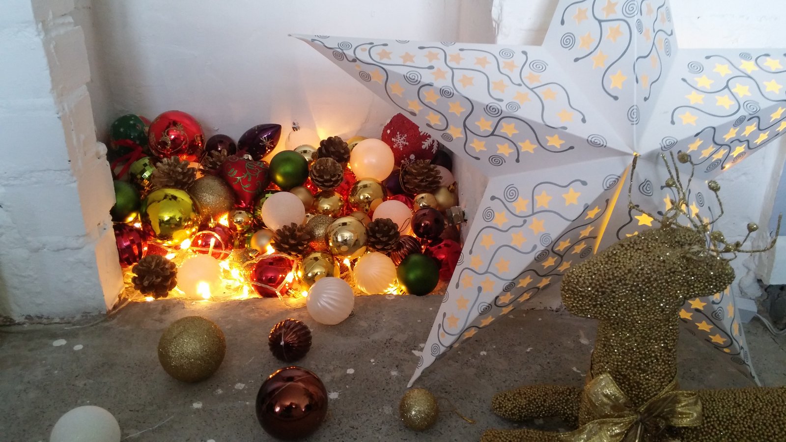 The last thing I just had to do to make the look of my living room complete was to decorate that empty hole in the wall/fire-place (I’m still hoping that my dream stove will be included in the Christmas sales). So because I had so many baubles from previous years that I don’t use any more (and I never throw thing away!) I decided to use them to decorate “the hole”. I placed some fairy lights at the bottom and then filled the fire place with all the Christmas baubles I had. That’s all! So simple! And it looks great!