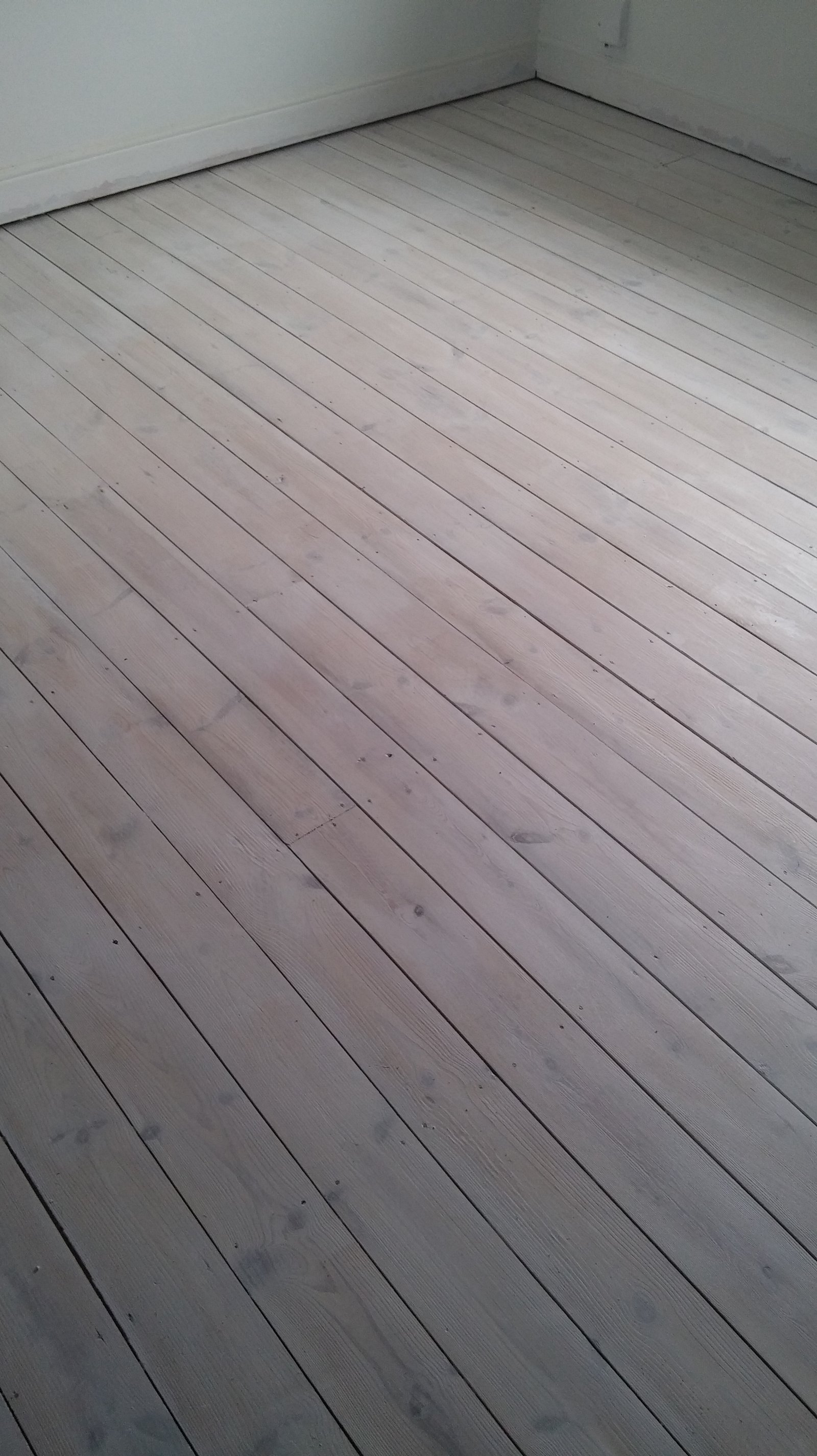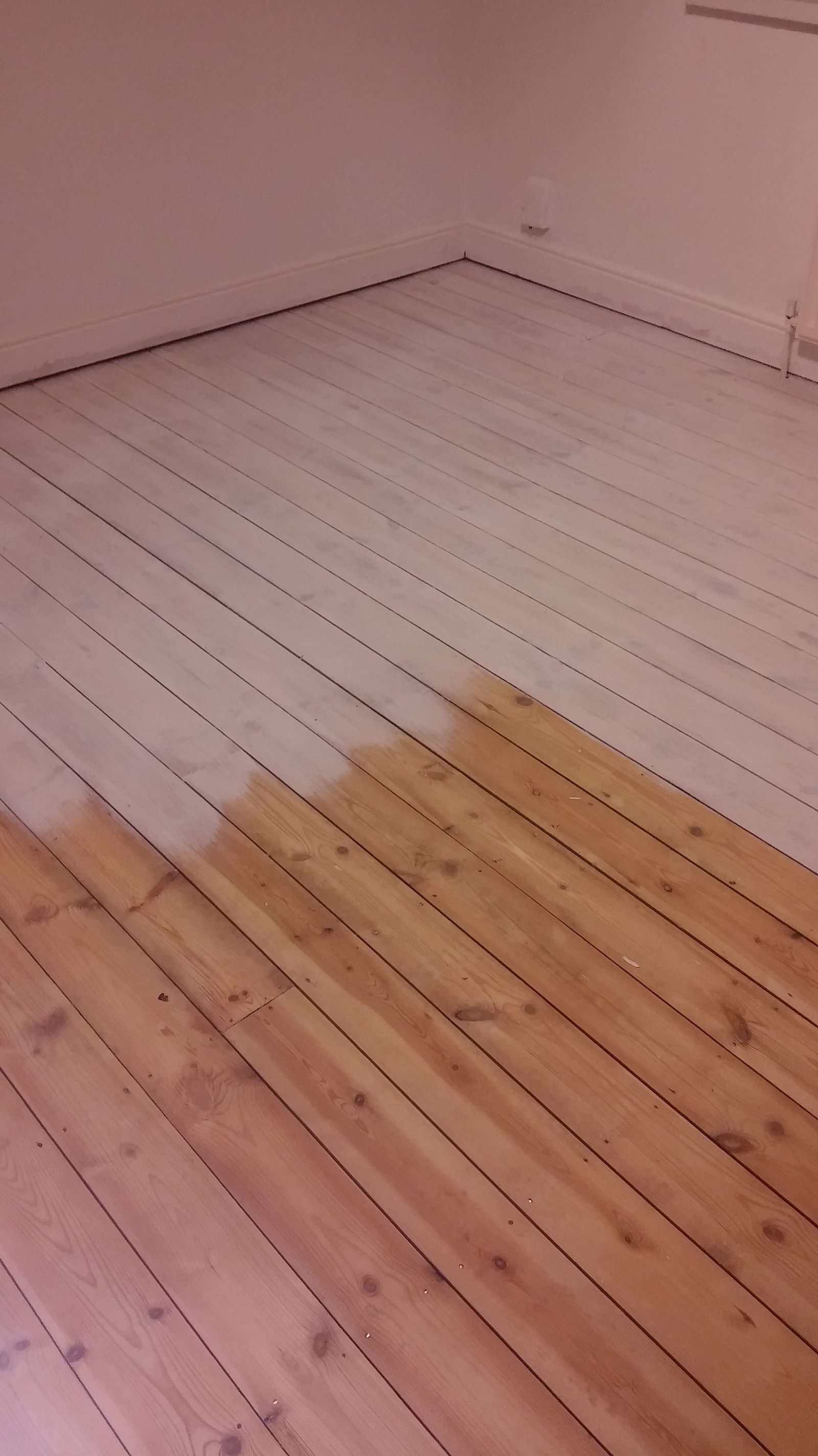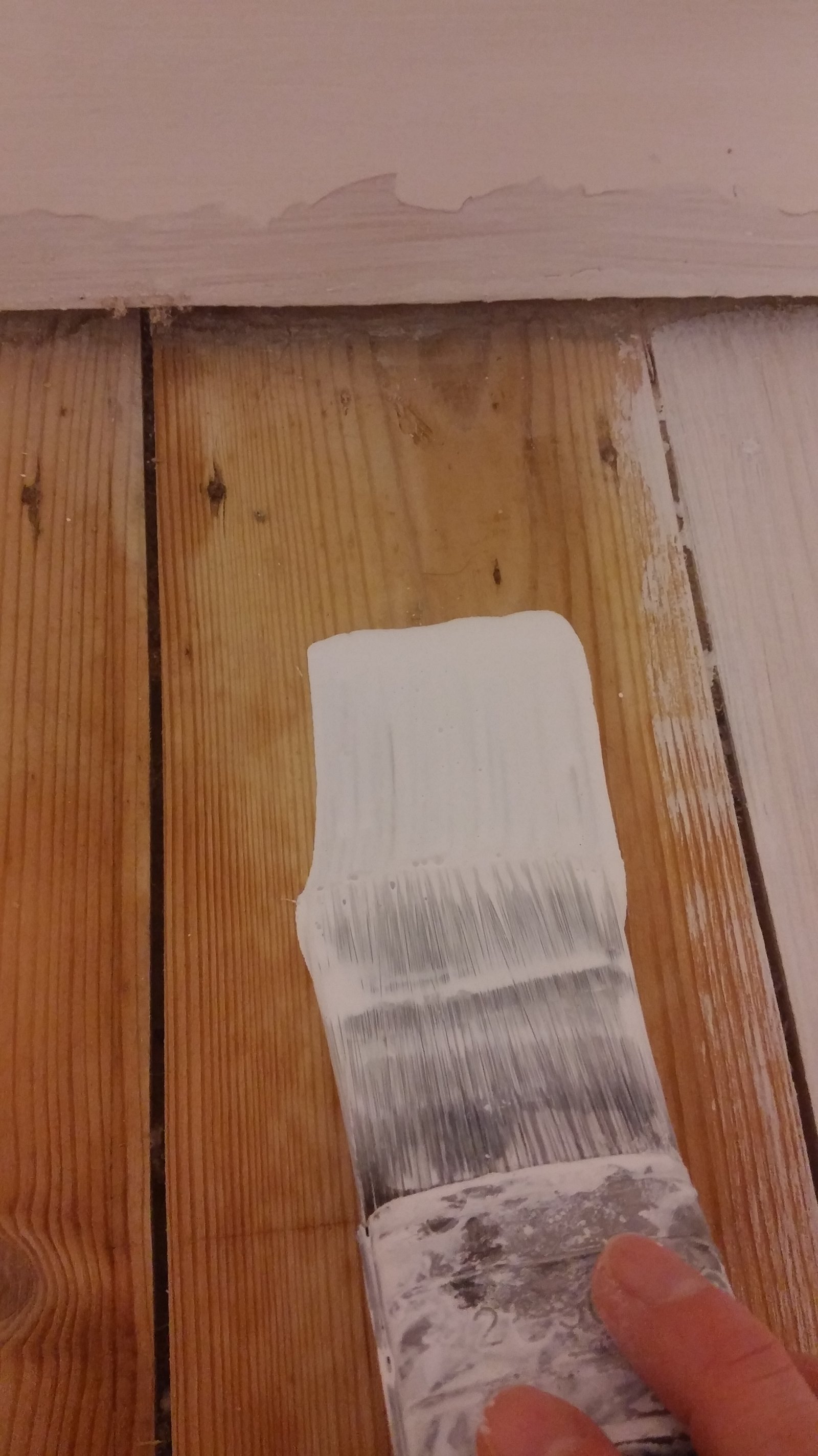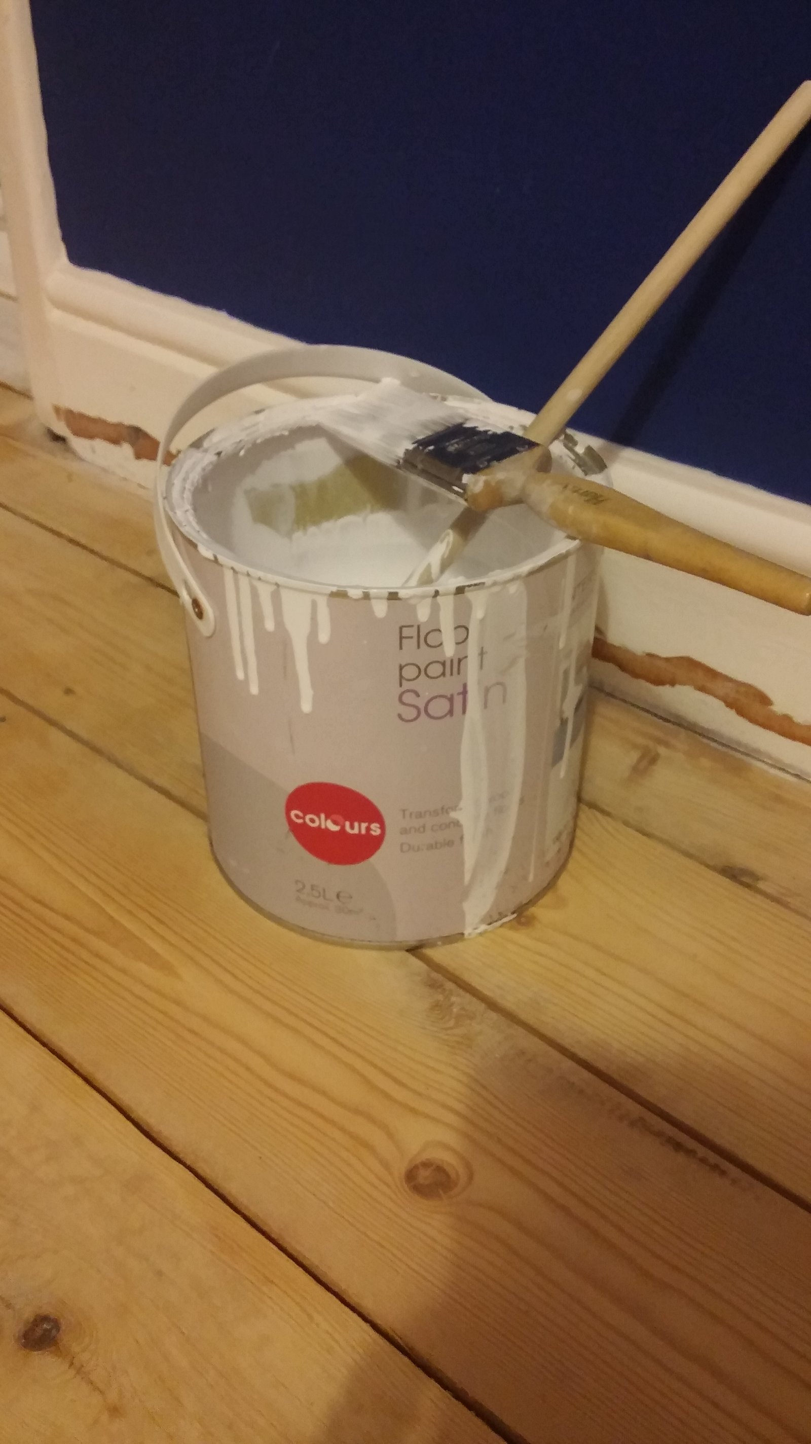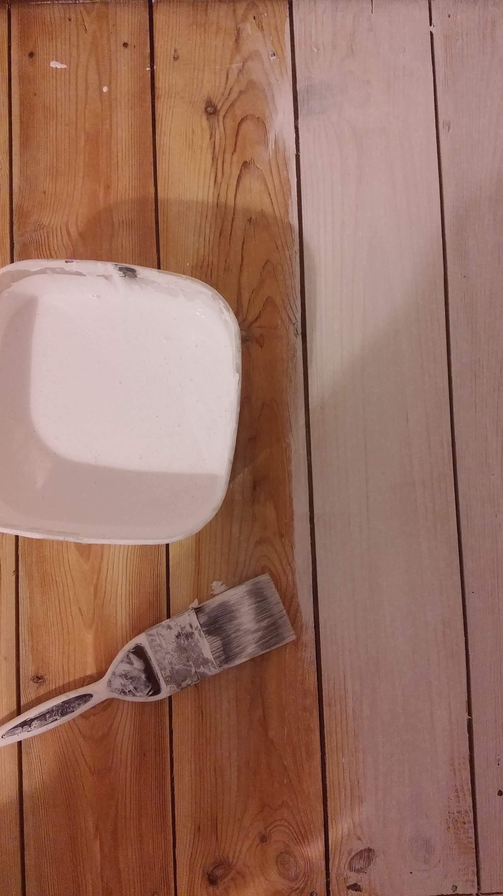 So starting in the corner of the room (the one opposite the door!) make your way with the brush, painting a floorboard after floorboard with gentle yet confident strokes (with the direction of the grain of the wood). Make sure you are happy with the colour remembering there will be another coat of paint on top of it, which means the end result will be darker and deeper. You want your first coat of paint to look something like this:
