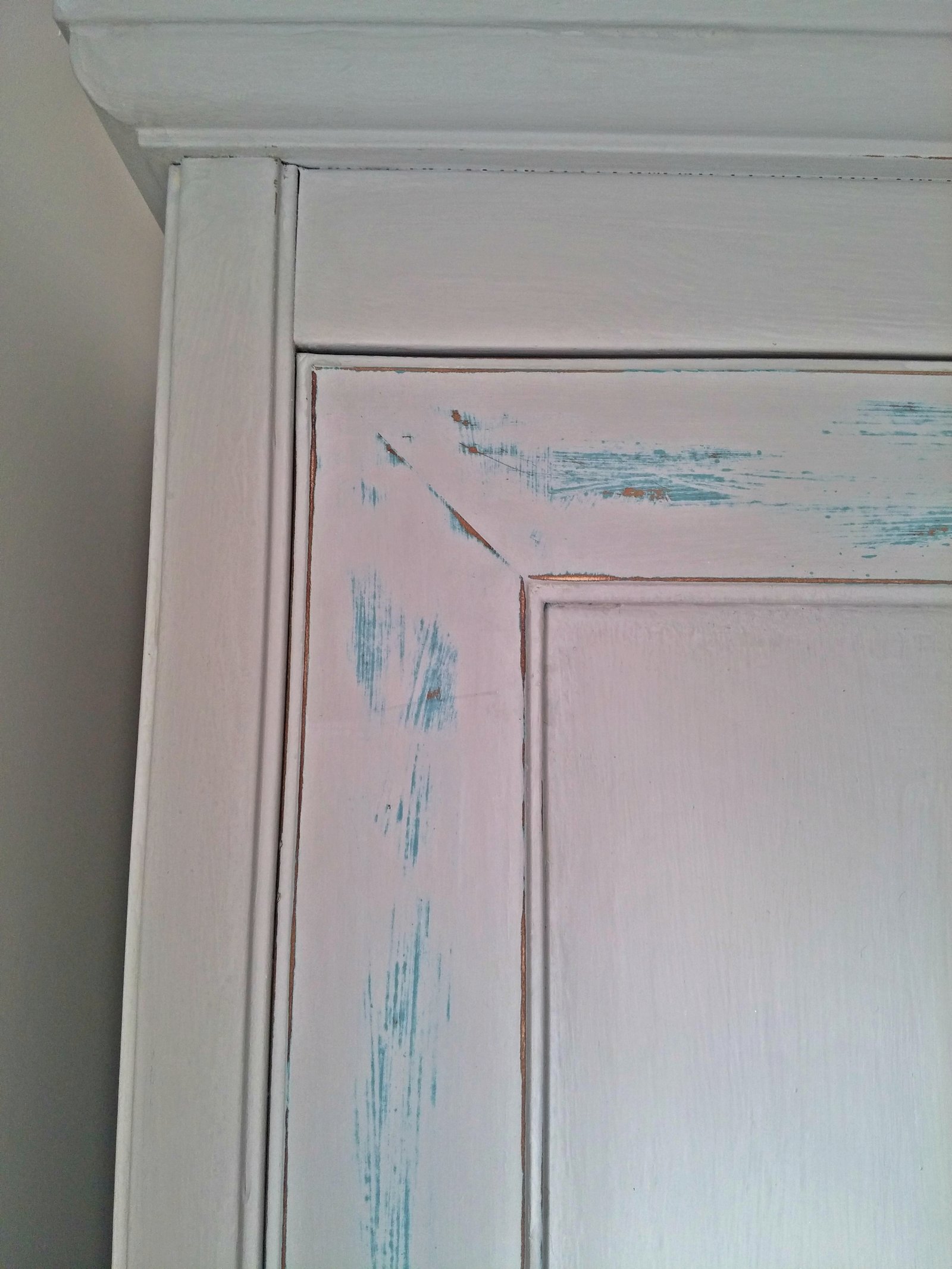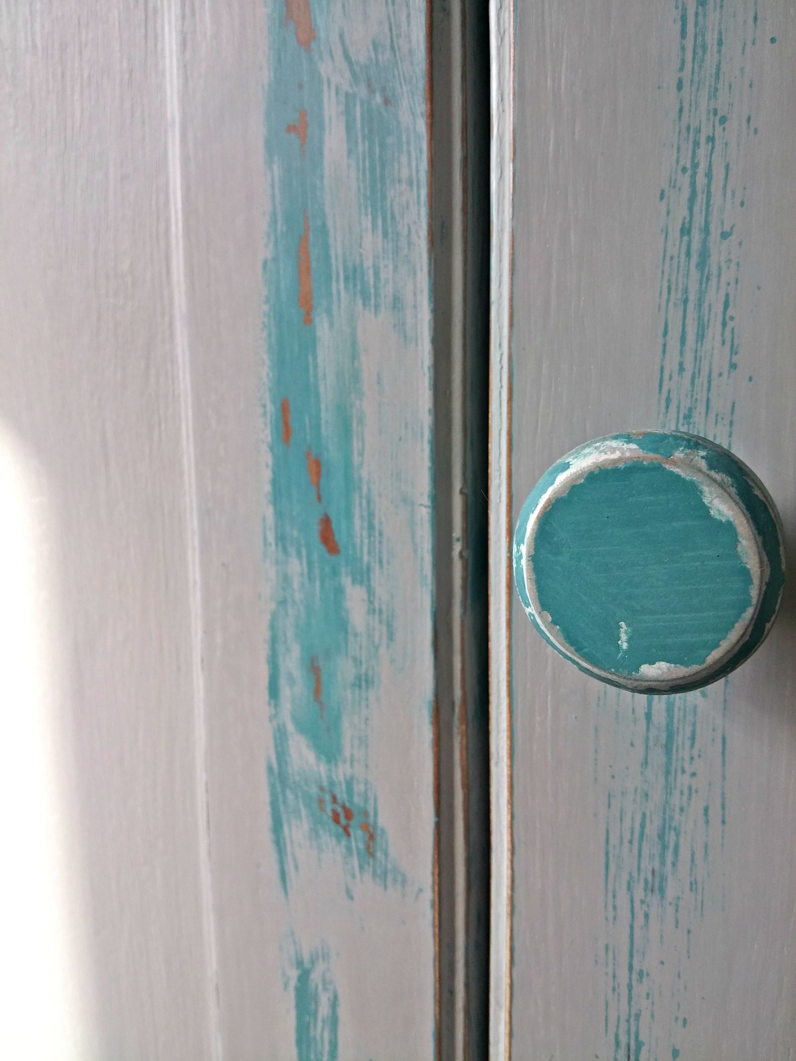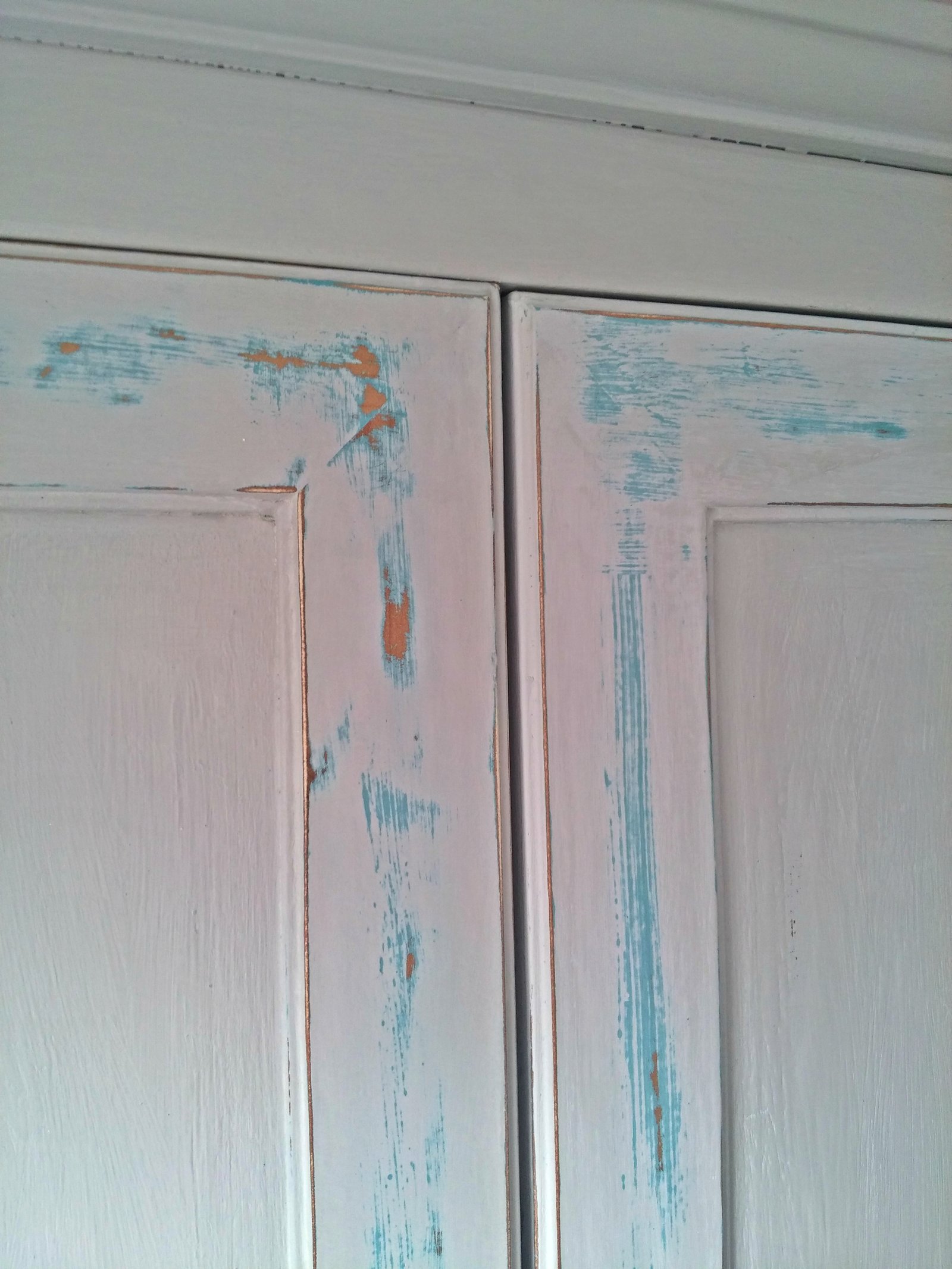 This wardrobe was only distressed on the panels around the doors where it was painted the teal colour underneath.