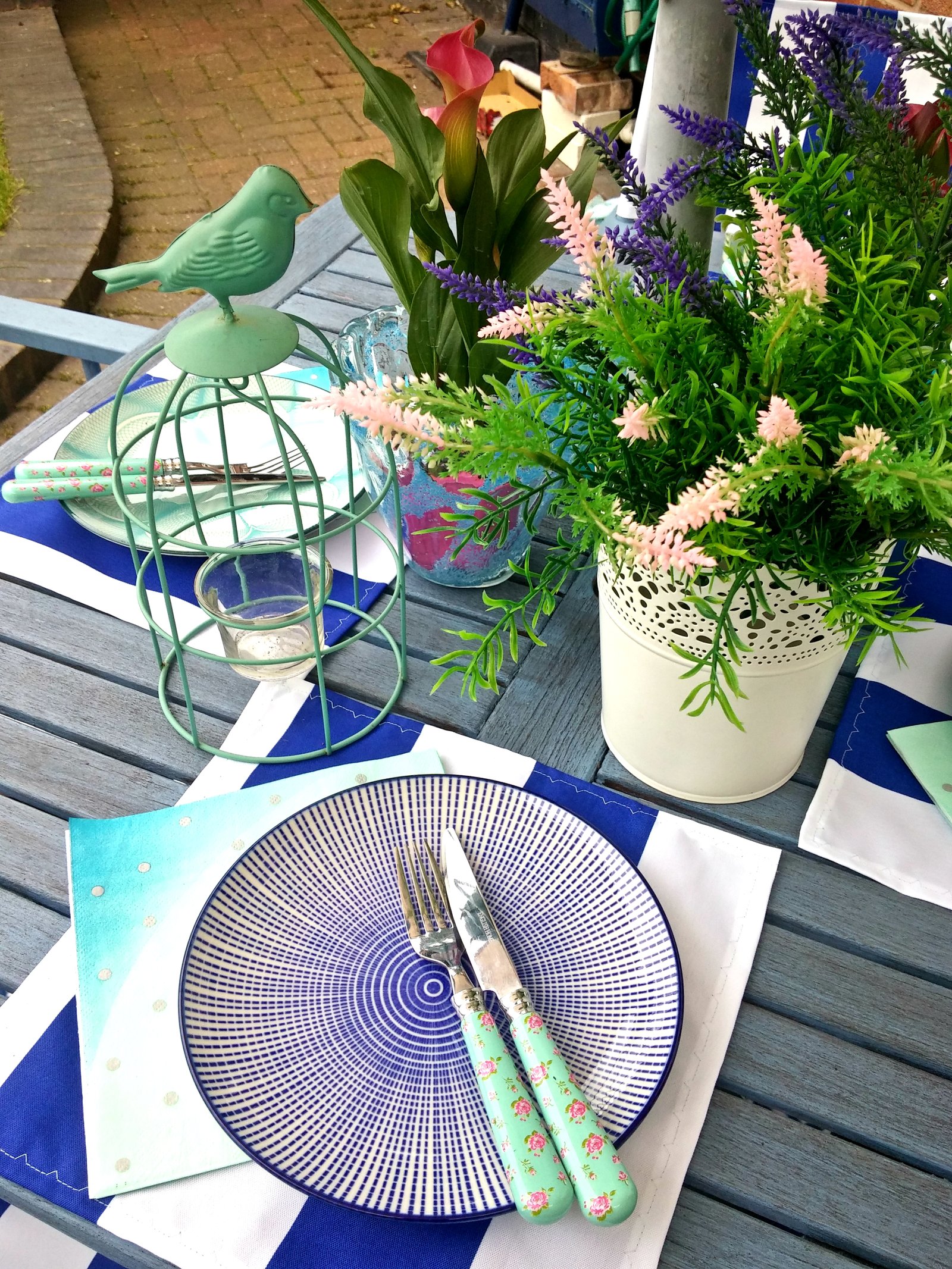 Table and chairs were bought on Ebay a few years ago. My cousin made these lovely fabric seats for us this year so the chairs are not just comfy but pretty too! And by adding bright colours to the garden you can be sure that it looks great even on the gloomiest of days. The wall behind the table needs repainting and I’m just considering the colour options as outside walls don’t always have to be white!