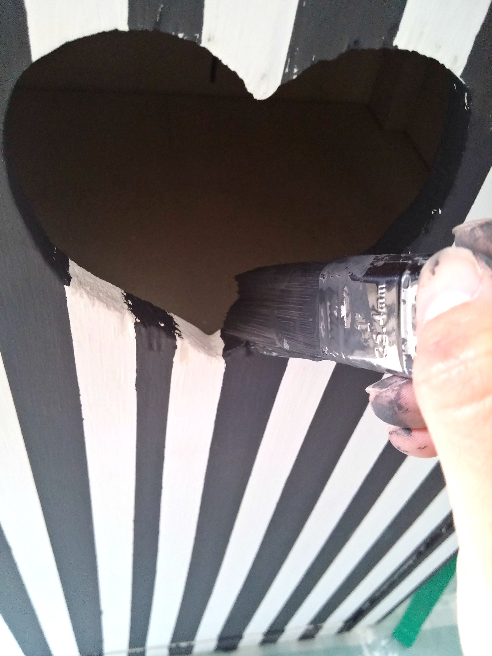 So with that problem sorted I started sticking the tape to the rest of the cabinet, creating stripes. (Again – make sure the stripes that suppose to be white are the same width as the ones you’re painting black)