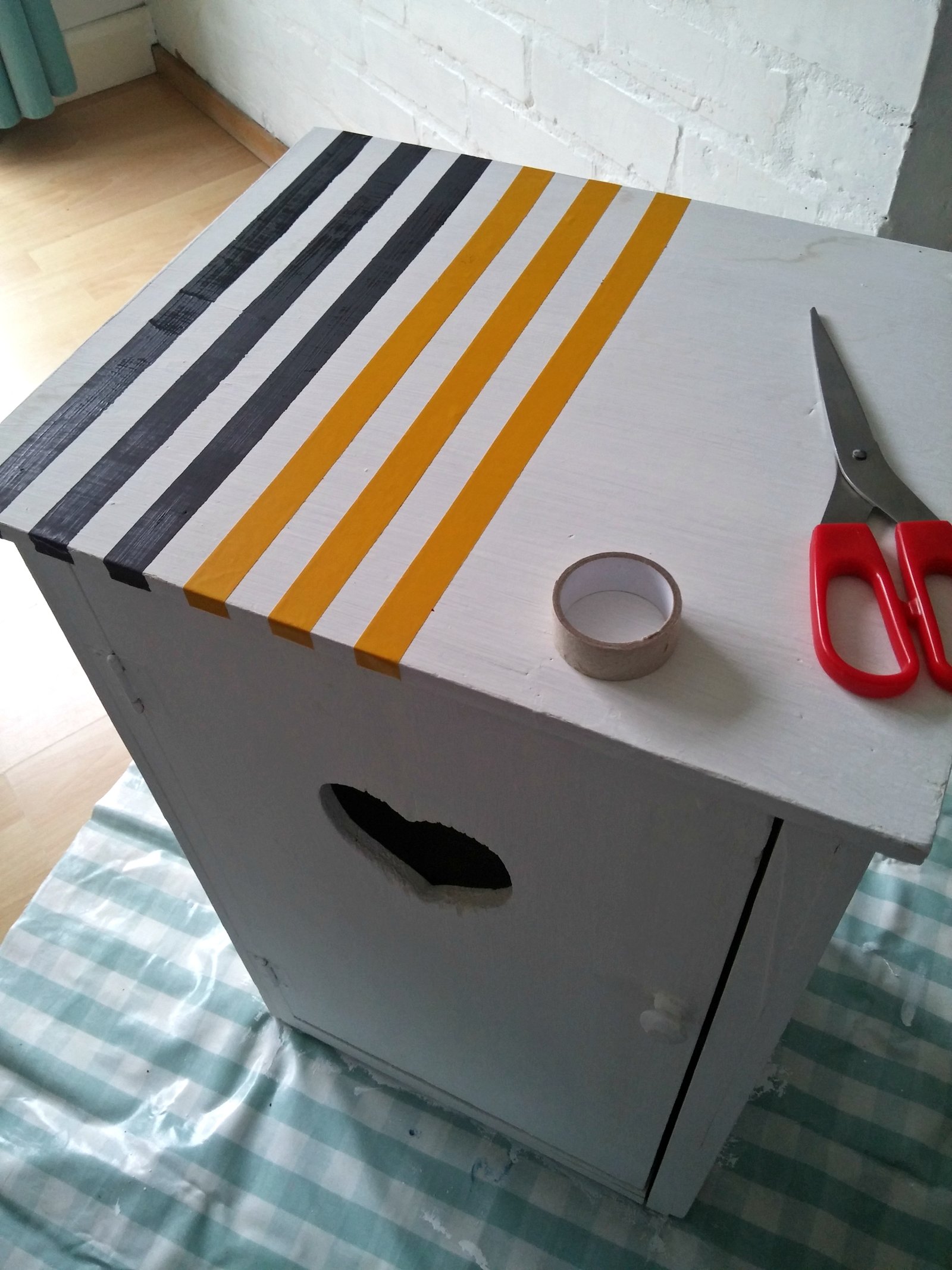 Obviously my first thought was to use a masking tape, like normal people do. Unfortunately the one I had at home was very wide and I wanted to create much narrower stripes. So after rummaging through my kids craft box I found some coloured isolating tape which was the perfect width so I decided to use it. (Don’t ask me why that isolating tape was in my kids box?!)