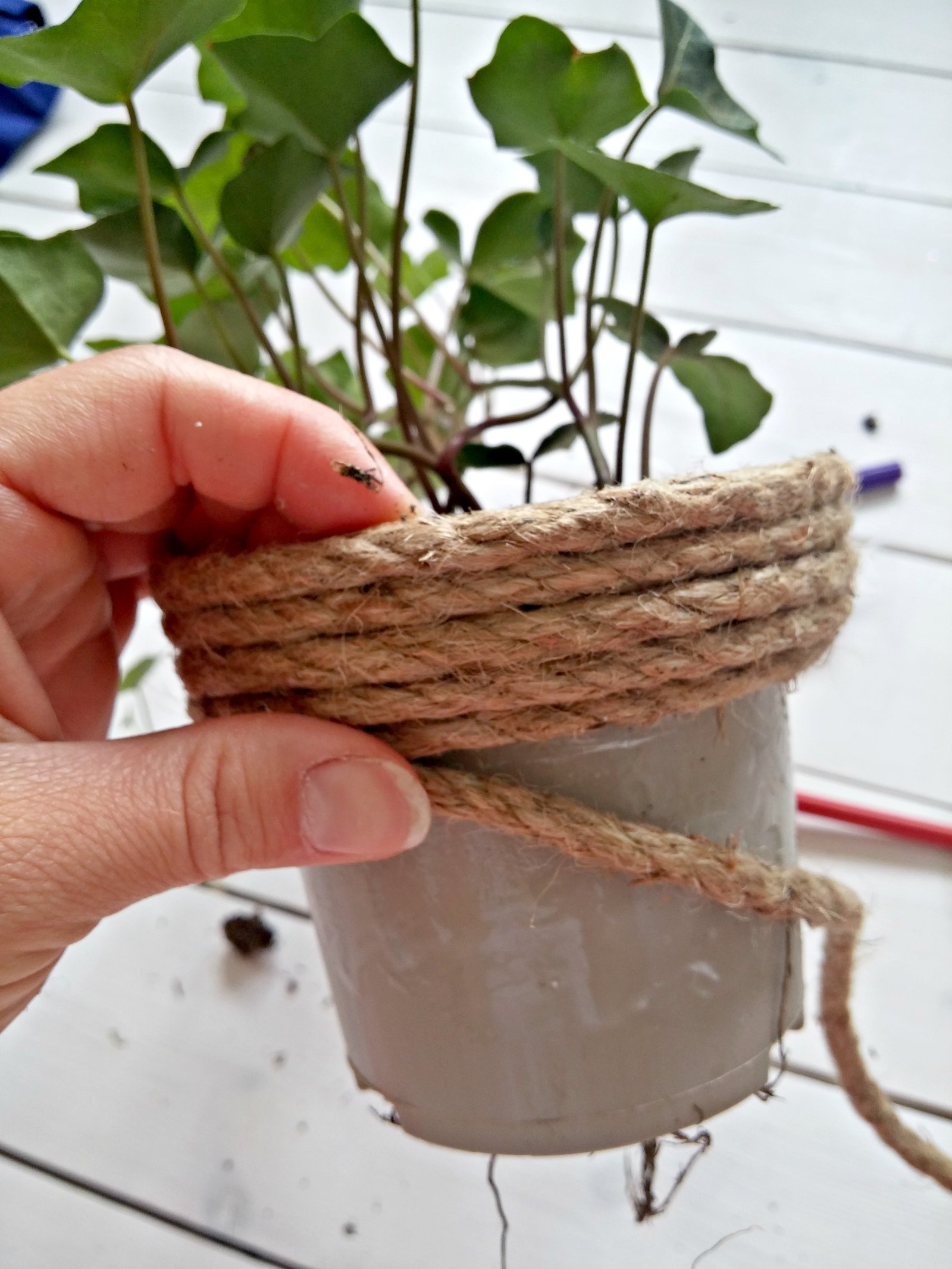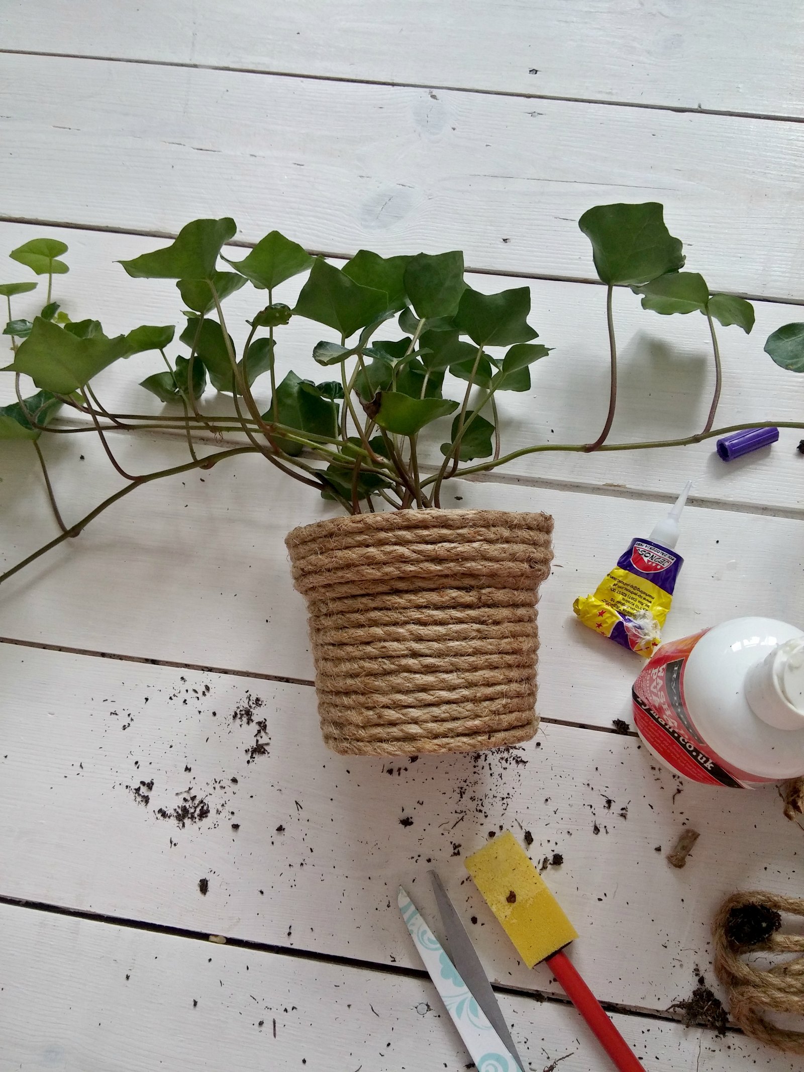 Start by generously spreading the glue on your plant pot (if you use a hot glue gun, just follow the instruction from the producer). Starting from the top stick the rope to the pot and work your way around it. If you use normal PVA glue expect the rope to be very “disobedient” at first. But after few more rounds it will finally give in and stick to the plastic pot. Press the rope to the plastic with your hands until you feel it’s ready to let go.