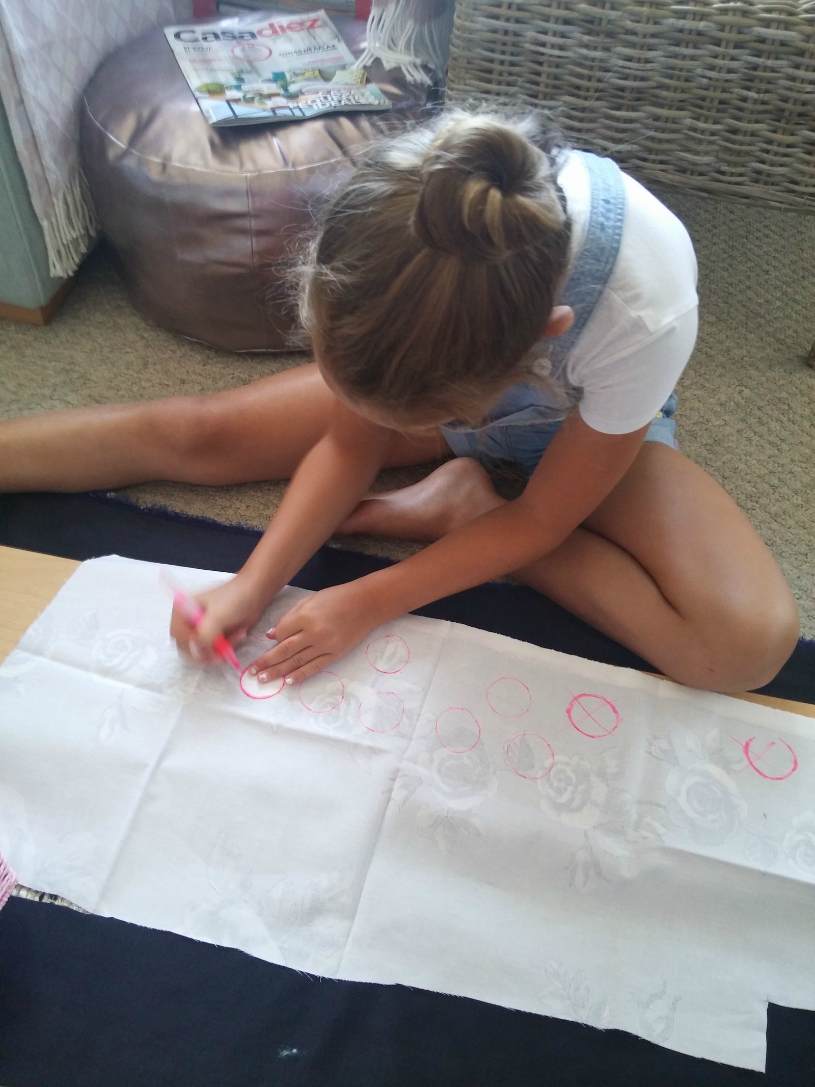 I started by measuring and marking on both panels where the buttons would go. When I was happy with the arrangement I made holes by drilling through the wooden panels. (The holes need to be big enough for the needle to go through) I also needed to cover the buttons with the same fabric I was going to use for the headboard. And that’s where I hit the wall again. The fabric wasn’t good for cutting it to such a small size as it easily split at the ends. But there is no problem that good old paint can’t fix, right? So I have quickly found a different fabric that I had left from one of my previous project. I used it to cover all the buttons (I even had a little helper). But as it was different colour to my fabric I decided to paint the buttons with my blue paint. They came out looking very nice which only proves that Annie Sloan’s paint it good for everything! I cut the fabrics and the wadding to size (to size means big enough to wrap around each panel).