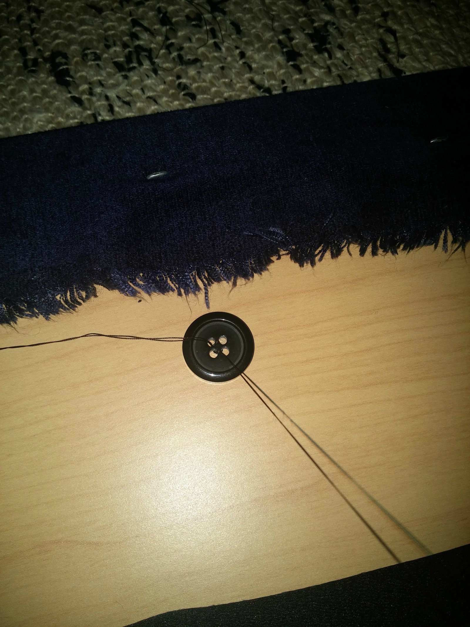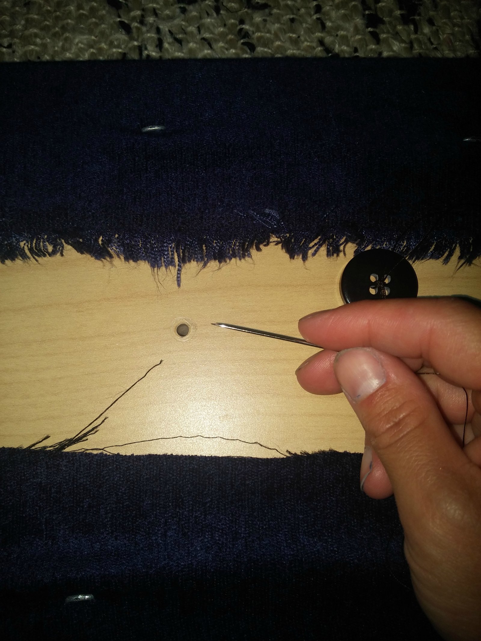 With all the fabric secured all that was left to do was to add the buttons. To do so you will also need some extra plain buttons to go at the back. Tie the thread to your first plain button.Using a a needle to go through the hole, thread through your fabric covered button,go back and secure it to the back button. Repeat with every button, making sure they’re not too loose.