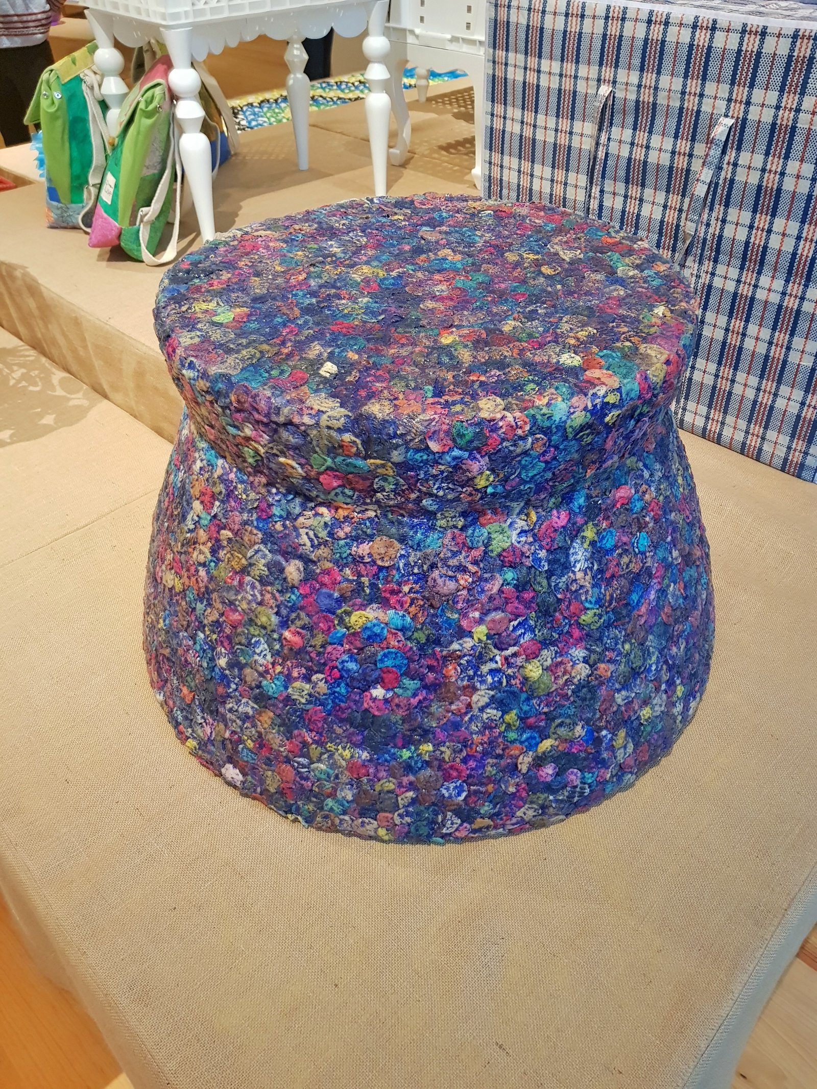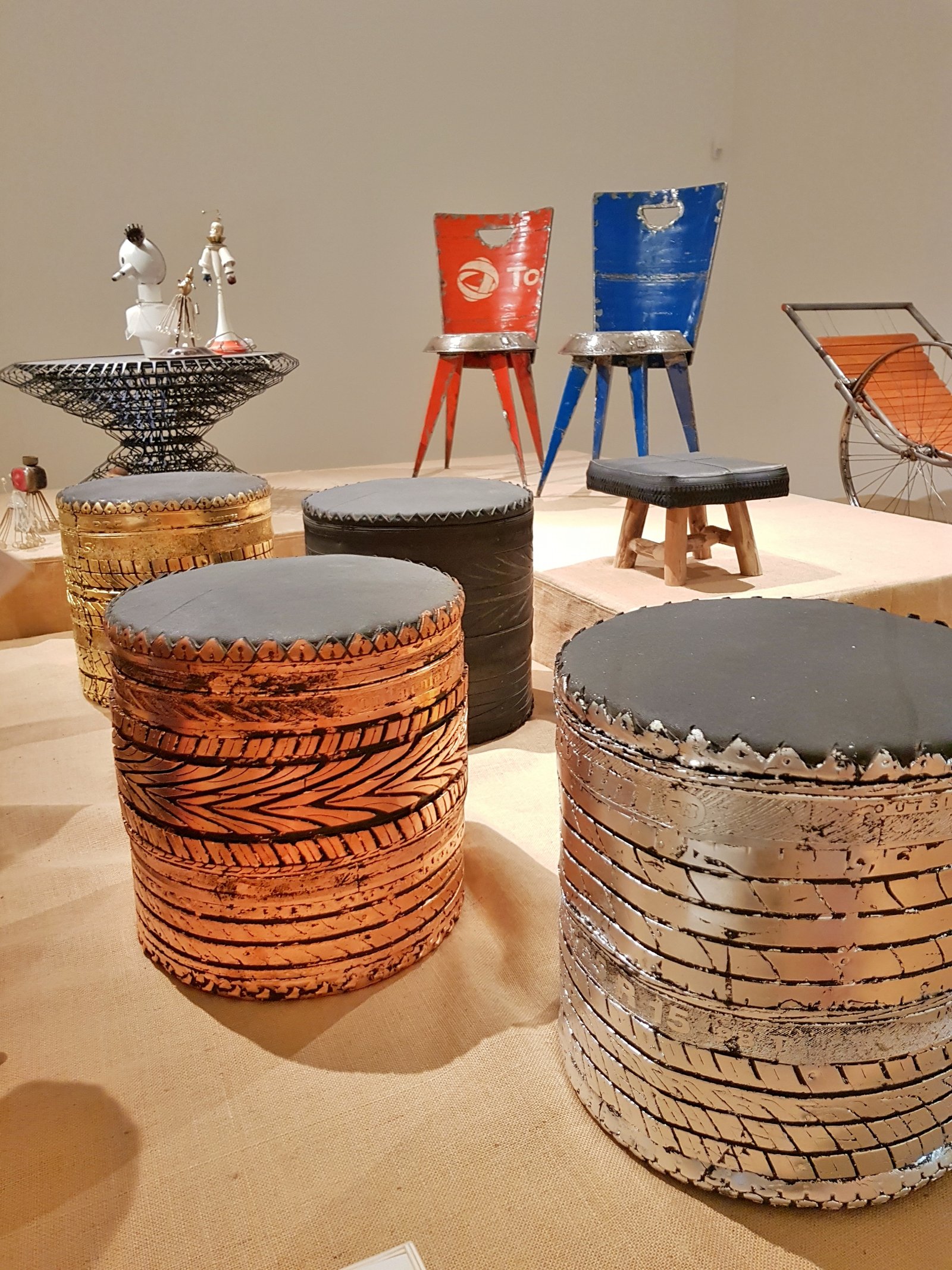 Fantastic exhibition! Love the creativity that has gone into turning waste into rather gorgeous products! The tyre stools are my fav, I’d happily have the gold one in my home!