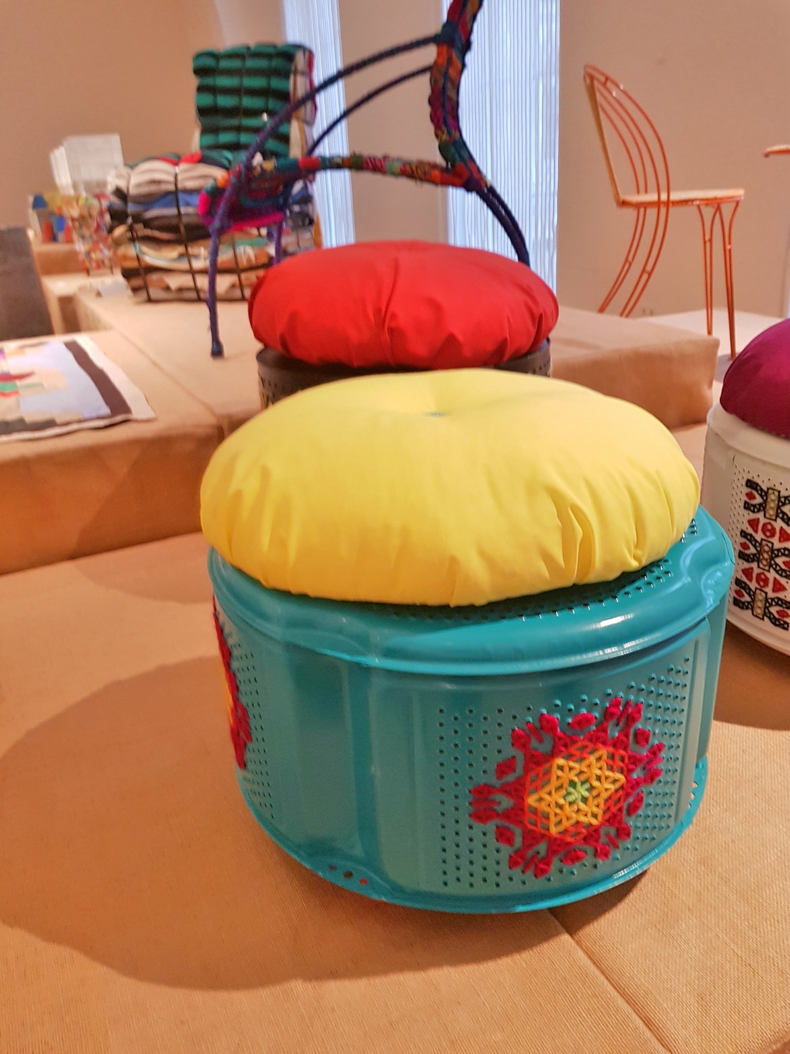 Wow, some interesting upcycled. I especially love the cross stitch on the washing machine drum chairs.