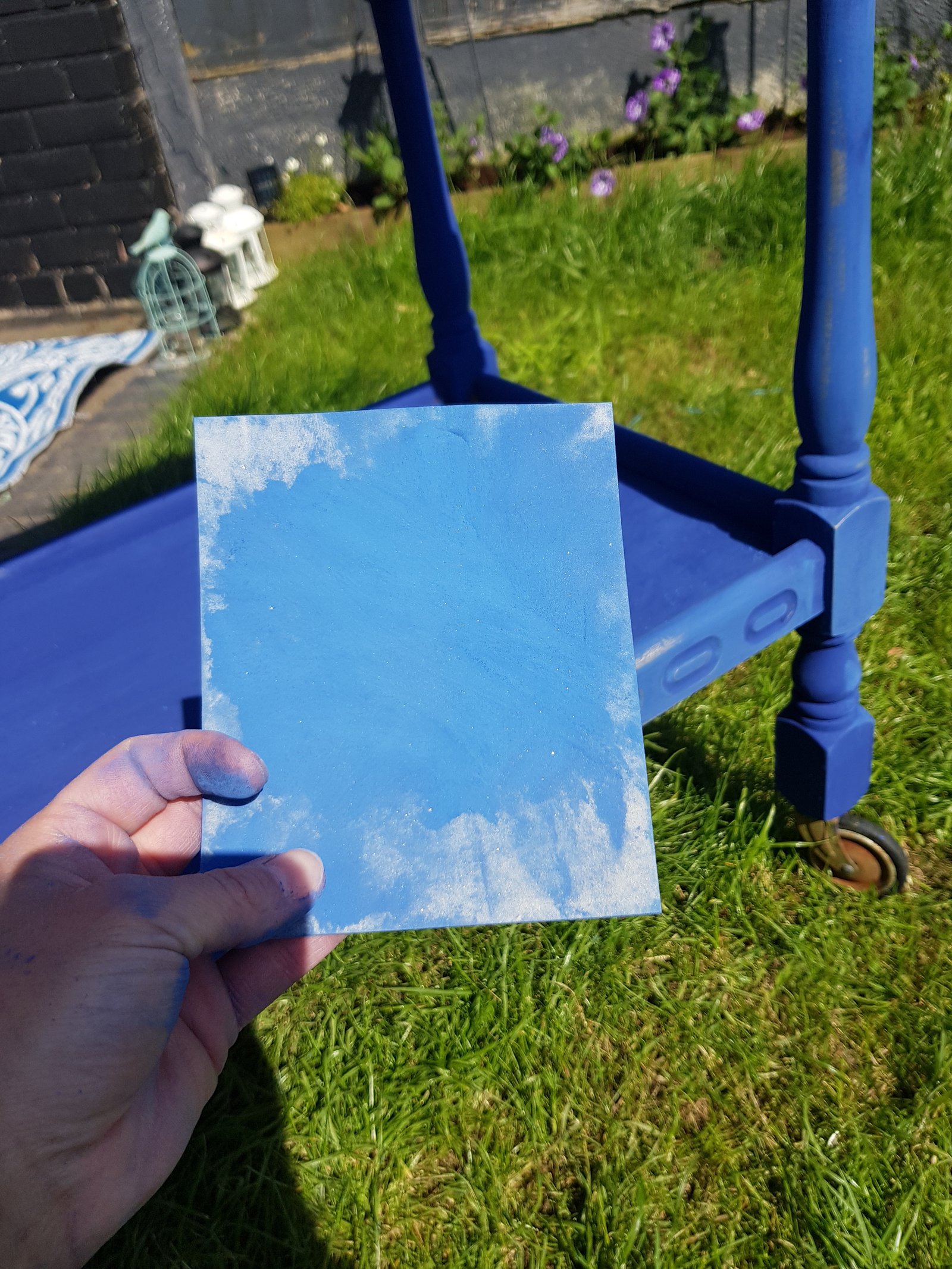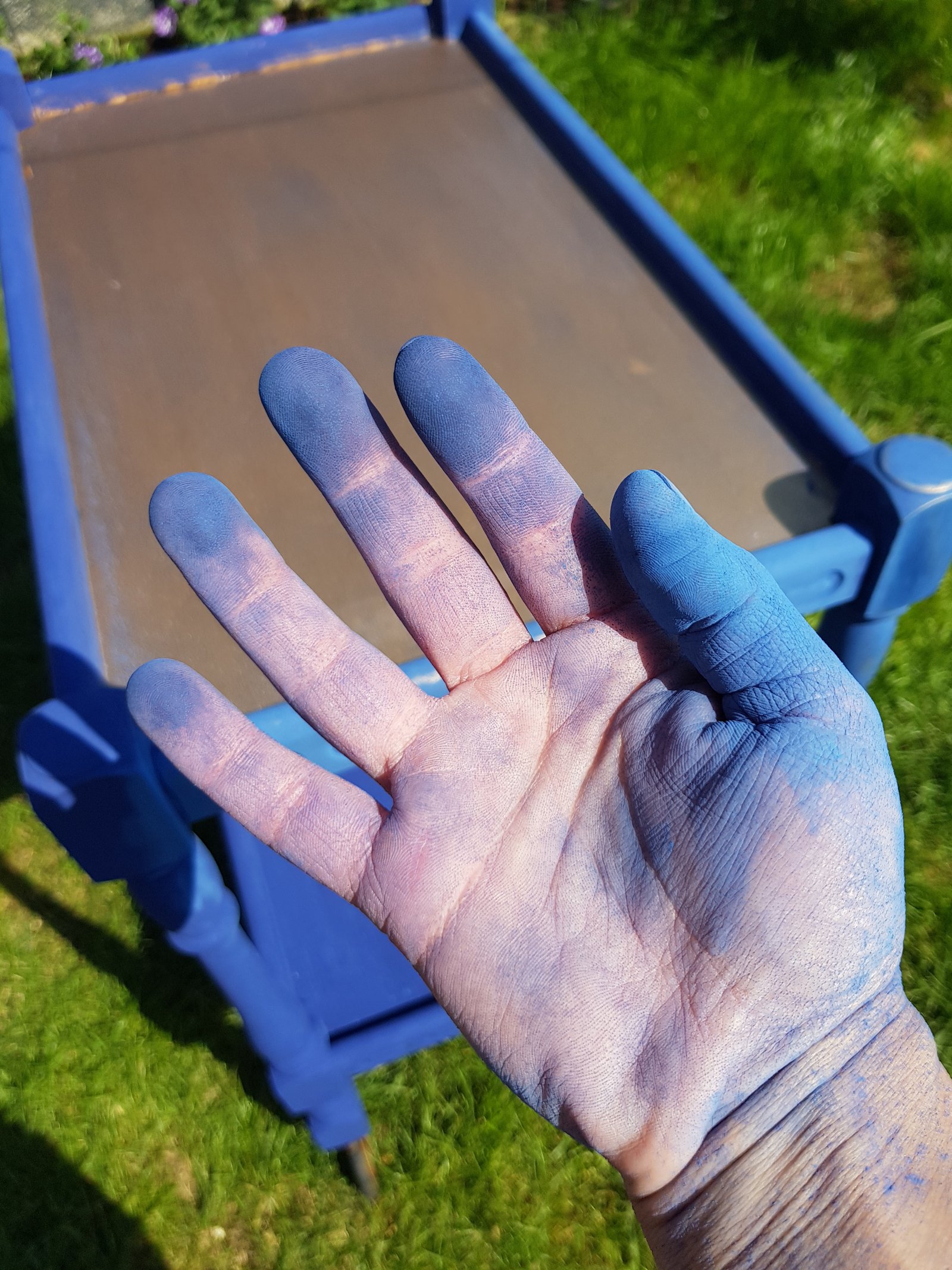 Back to the trolley. The blue paint went on and the gold disappeared. But not for long though as after some light sanding down the gold started to reappear again. And what happened with the blue?