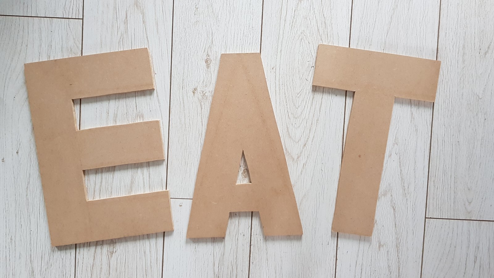 First you need to decide on the word. EAT has only three letters and no awkward shapes so should be easy enough whatever your DIY skills are. And especially if you’re not very confident jigsaw user, like me. Although if you like having all your fingers and thumbs you still have to be fairly confident with it. But it’s better to be safe than sorry, so remember there’s no shame in asking for help! But if you’re still reading this, your skills are probably better than mine and I’m happy to report no fingers have been lost in making this wall sign!