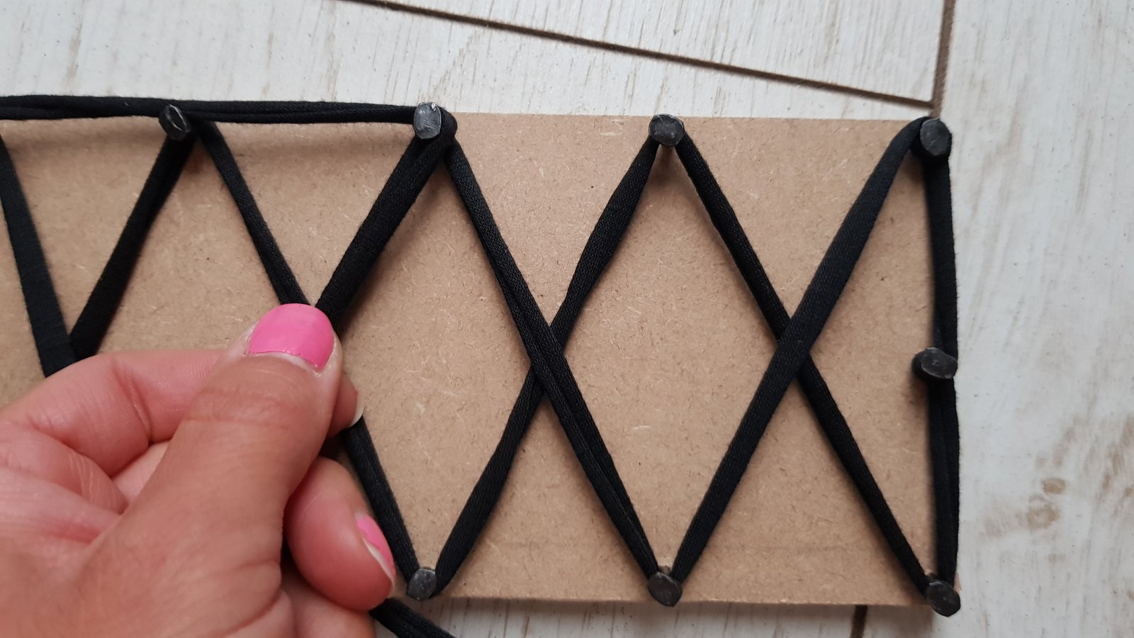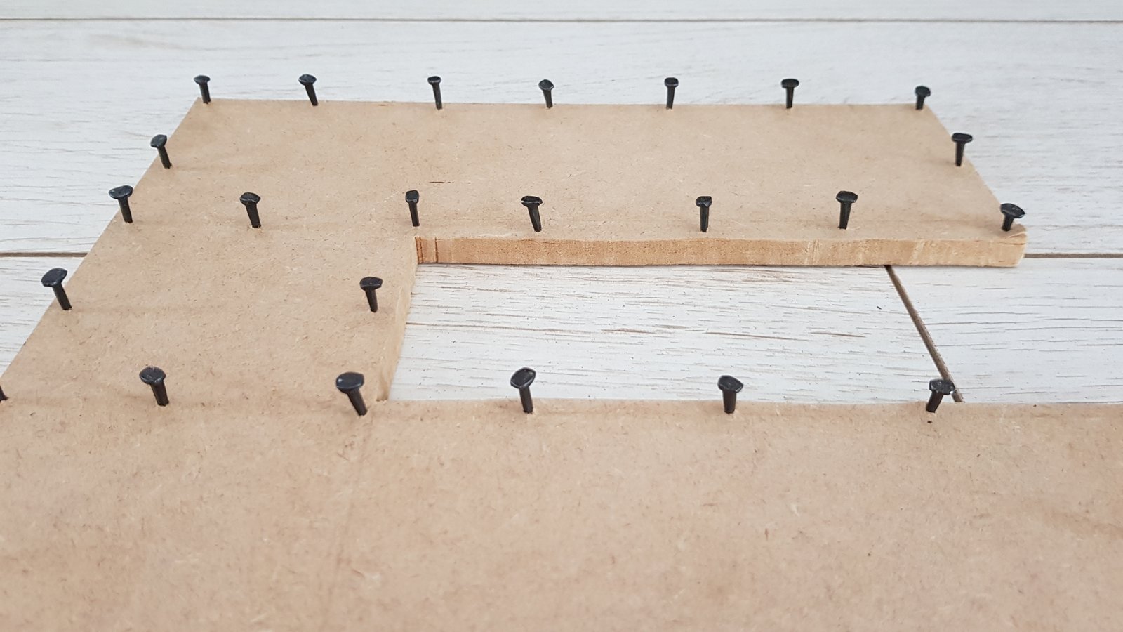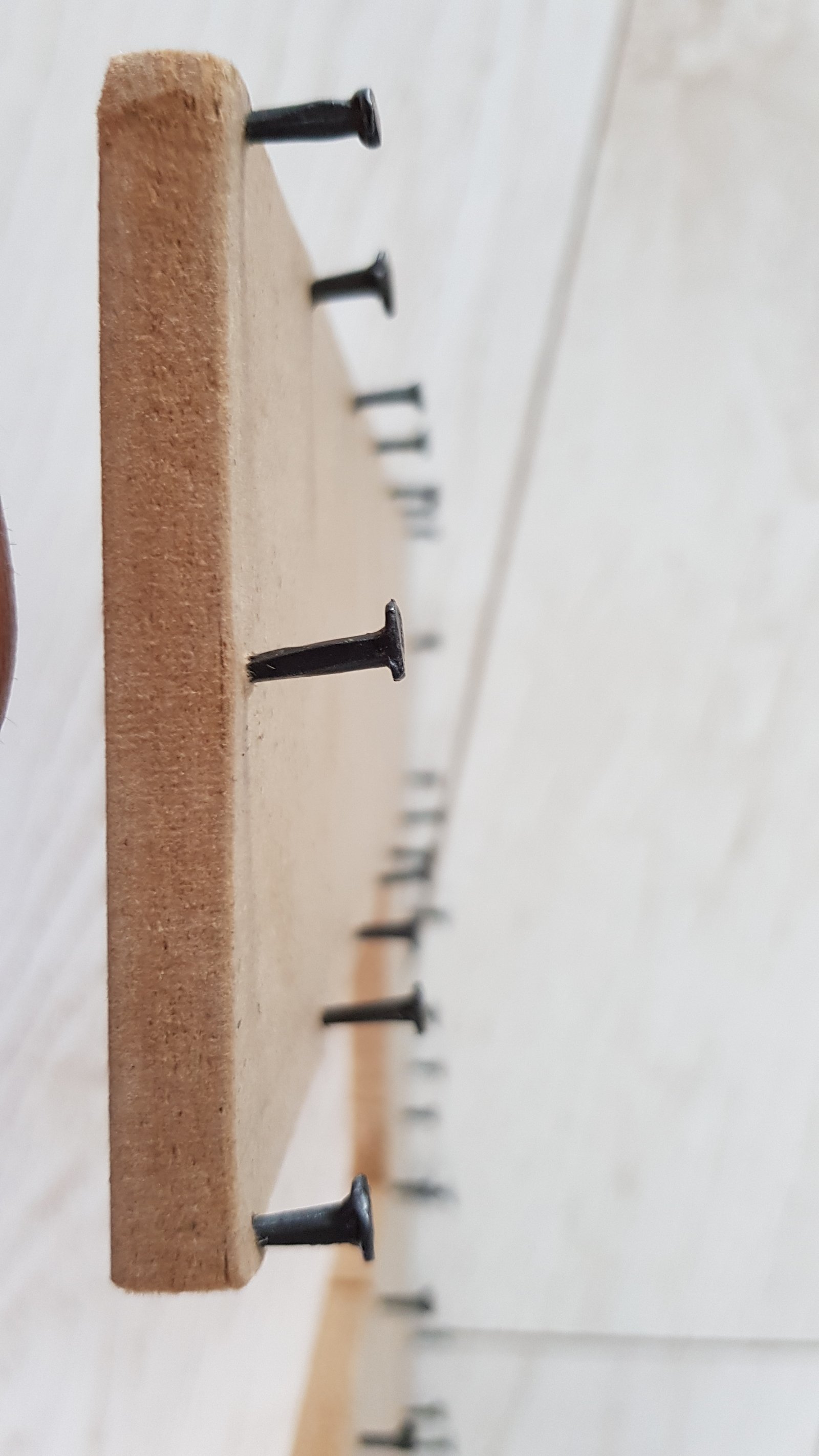 Start nailing the nails down with a hammer (make sure to keep the hammer away from your own nails though). Keep the gaps between the nails roughly the same. You can space them out by measuring first, although I didn’t do it. You don’t have to go just around the edges, you can spread the nails out as randomly as you wish.