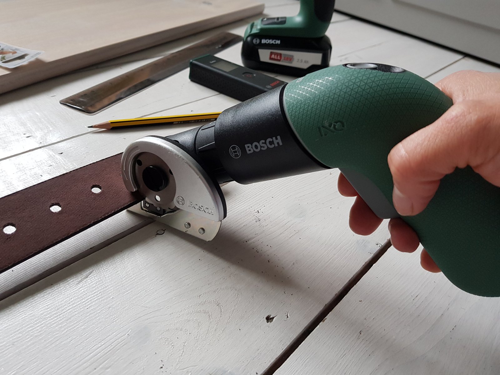 Firstly you need to prepare the belts. You want two exactly the same length straps for your shelf. No buckles. The holes that are already in the belts are fine, they add a decorative element to it.  The first hole (the furthest from the buckle) will be the one used for attaching the shelf to the wall.  Make a first cut around 1cm away from the first hole. You can use scissors but IXO cordless screwdriver with cutter adapter makes it so much easier. Repeat with the other belt.