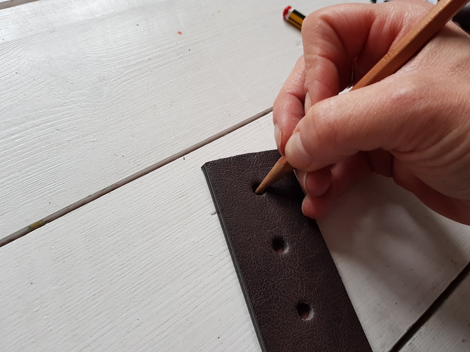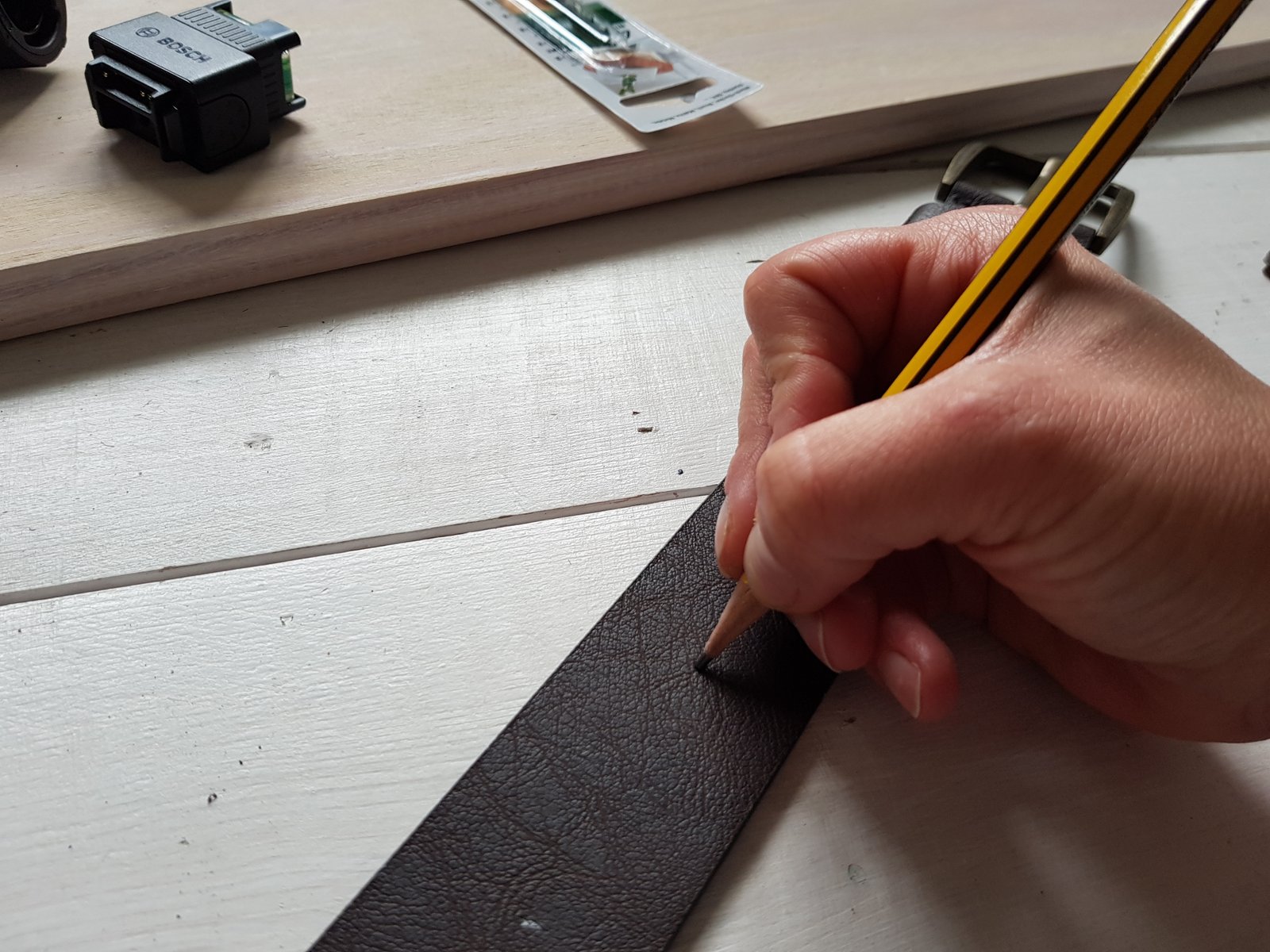 Now you will need to make a hole at the other end of the belt (for the screw to go through when attaching to the wall). It needs to be the same distance from the edge as the first one. The easiest way to do it is by folding the belt in half (make sure the edges meet). Mark it through the first hole with a pencil and using a cordless drill make a hole in the marked spot. Now repeat with the other belt.