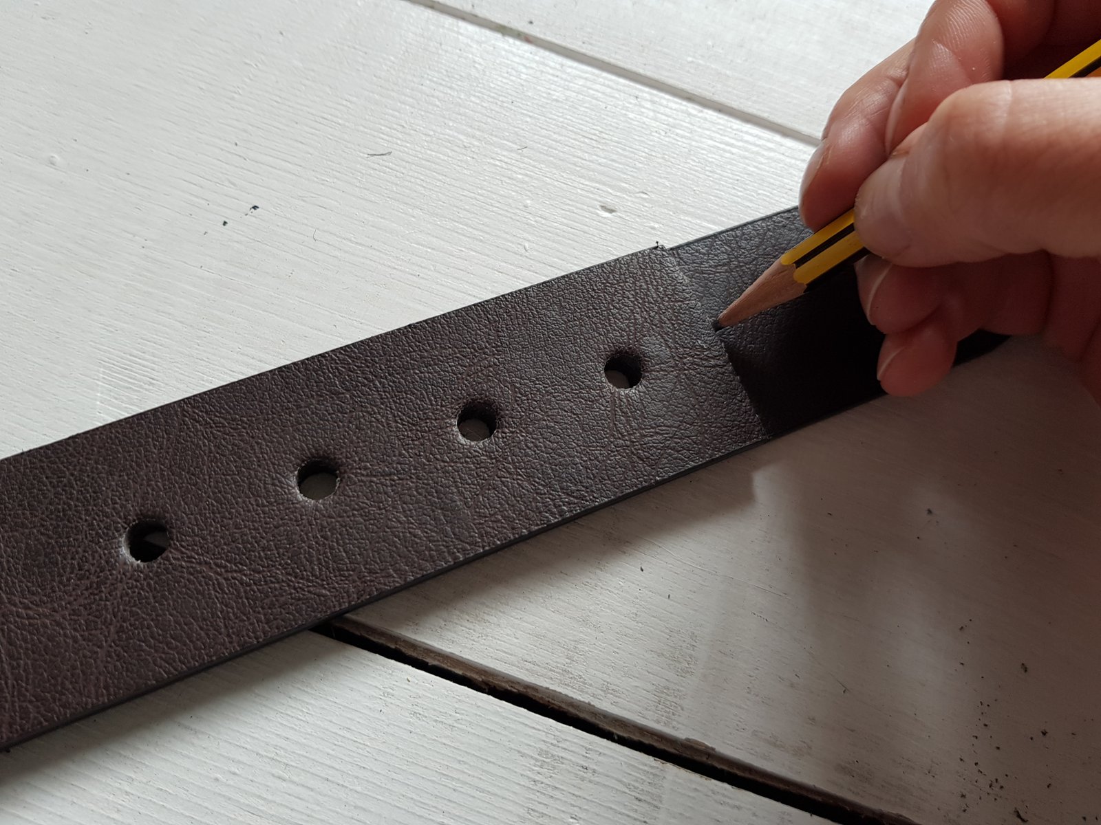 Now measure around 90cm away from where you’ve just made a cut and mark with a pencil. That’s where you’re gonna make a second cut. Repeat with the other belt.