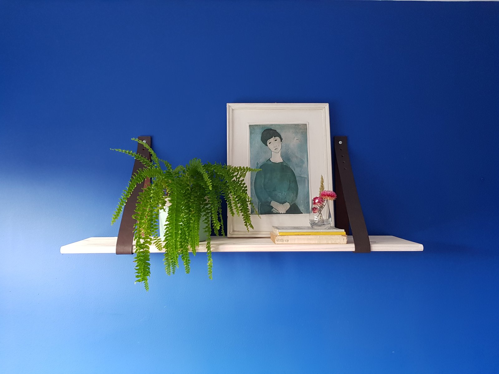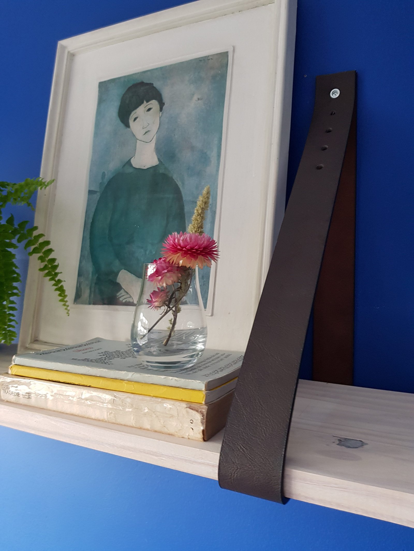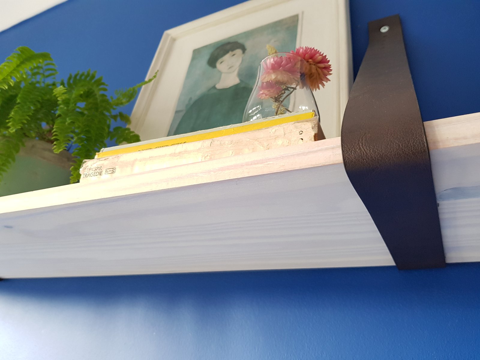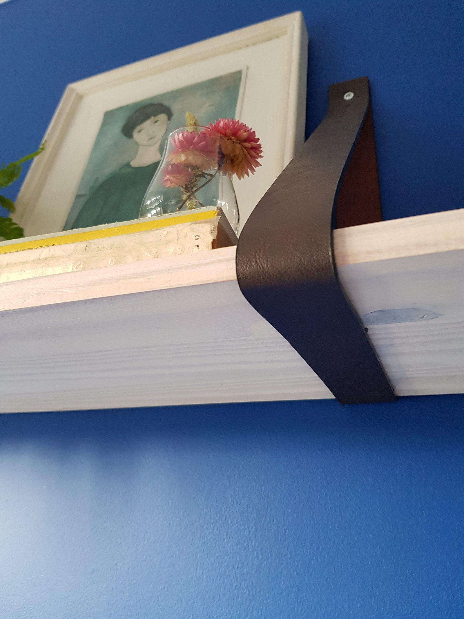 And there you go. You now have everything ready to put your DIY leather strap shelf up on the wall.