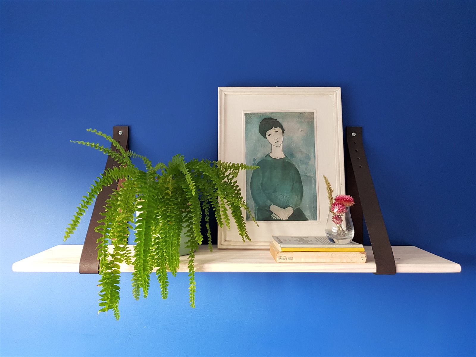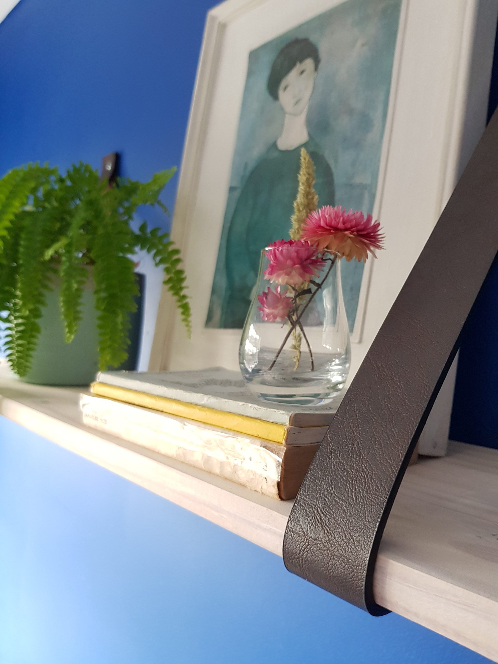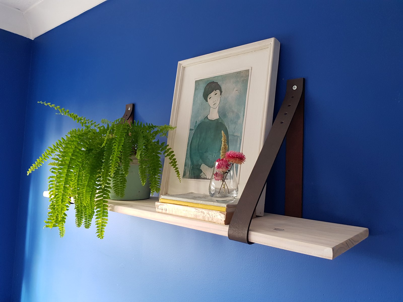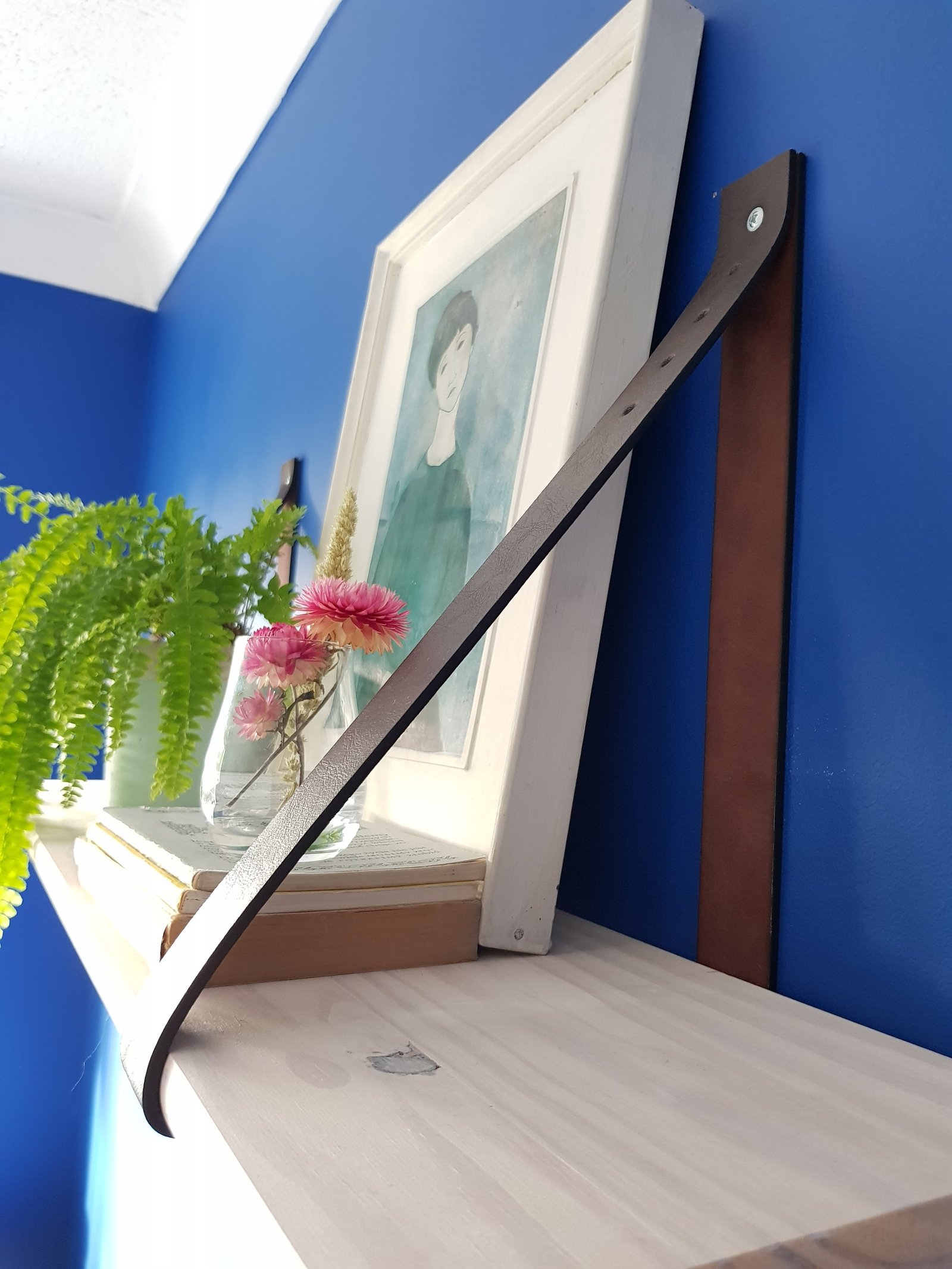 And there you go. You now have everything ready to put your DIY leather strap shelf up on the wall.